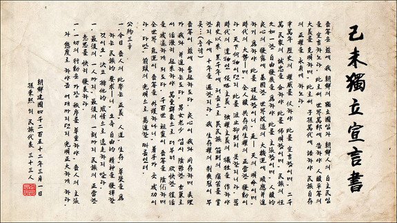 吾等은玆에我朝鮮의獨立國임과朝鮮人의自主民임을宣言하노라此로써世界萬邦에告하야人類平等의大義를克明하며此로써子孫萬代에誥하야民族自存의正權을永有케하노라半萬年歷史의權威를仗하야此를宣言함이며二千萬民衆의誠忠을合하야此를佈明함이며民族의恒久如一한自由發展을爲하야此를主張함이며人類的良心의發露에基因한世界改造의大機運에順應幷進하기爲하야此를提起함이니是ㅣ天의明命이며時代의大勢ㅣ며全人類共存同生權의正當한發動이라天下何物이던지此를沮止抑制치못할지니라